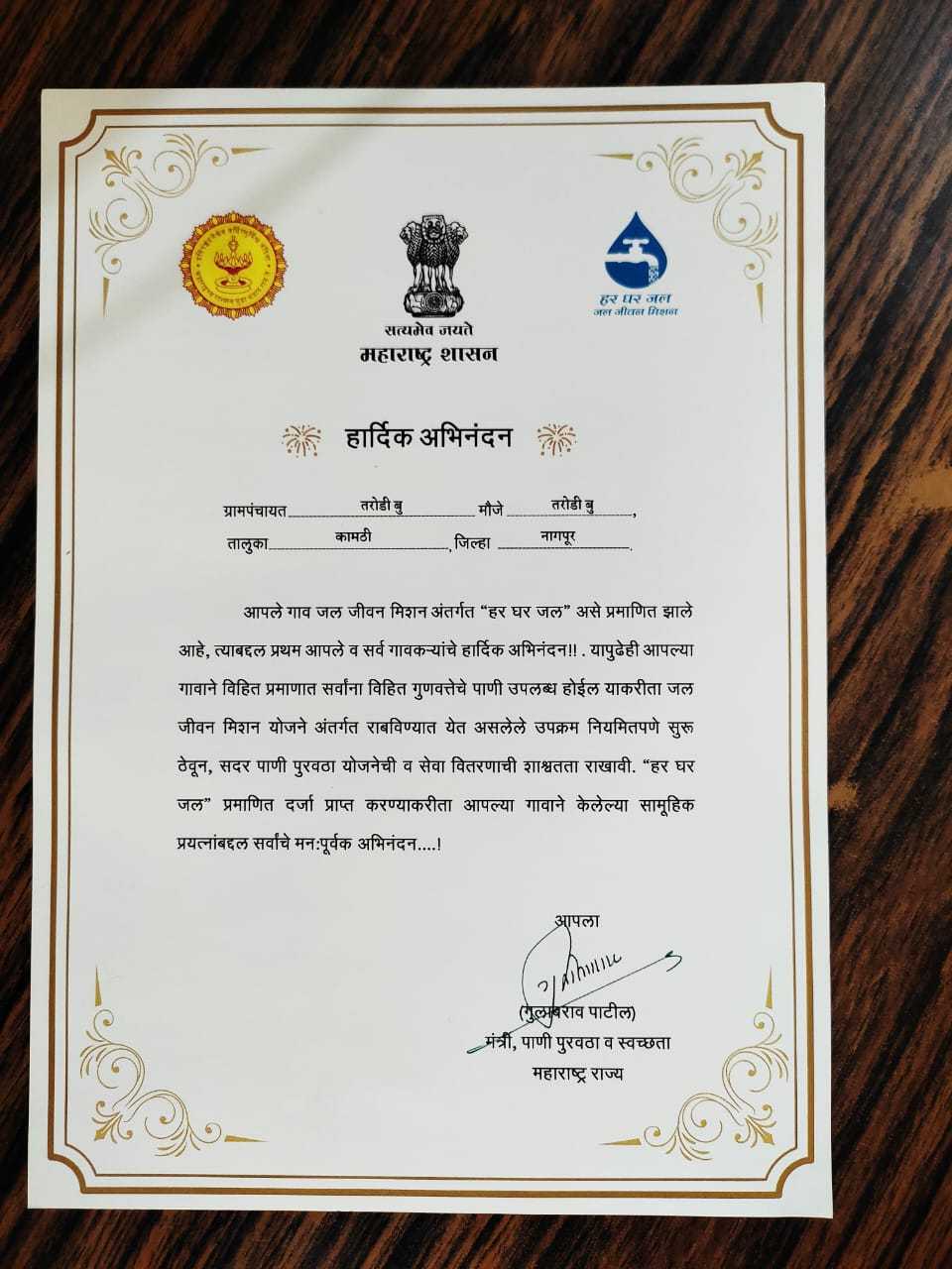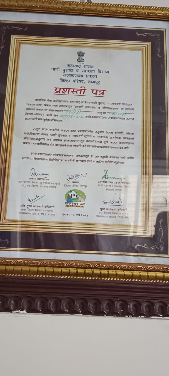 जलस्वराज्य प्रकल्प प्रशस्ती पत्र